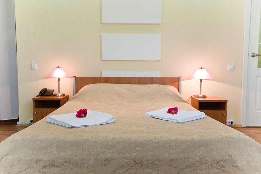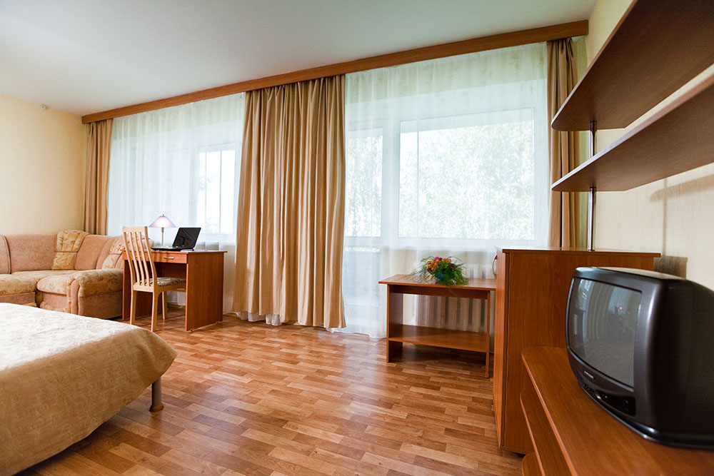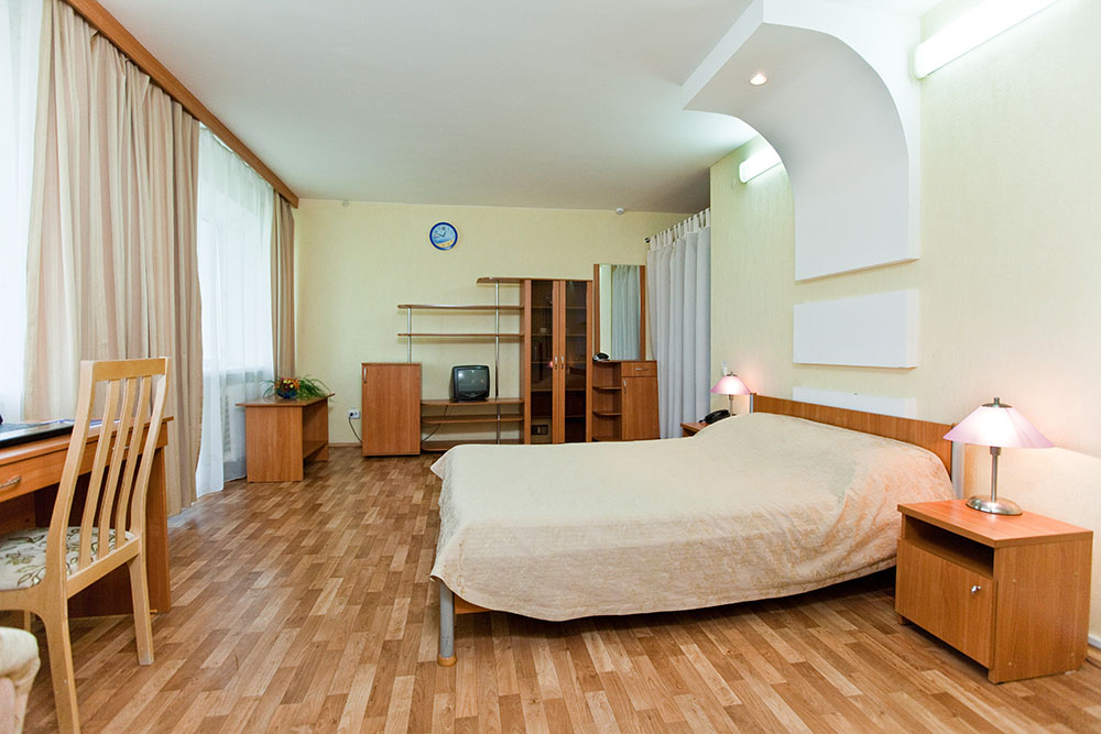 Площадь номера - 23,5 кв.м. В номере: 1 комната, госитинная с мягкой мебелью, спальня с двумя раздельными кроватями, журнальный стол, ТВ, сейф, холодильник, стенка для посуды, телефон, гардероб, кондиционер, балкон. Номер оборудован электронным замком. В ванной комнате: совмещенные душевая кабина и санузел.