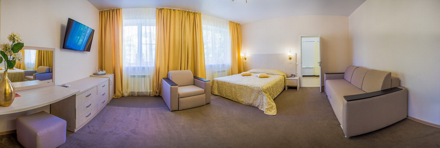 Площадь номера 29кв.м.: в номере двуспальная кровать, диван, телевизор, холодильник, шкаф для одежды, ванна, санузел, кондиционер.