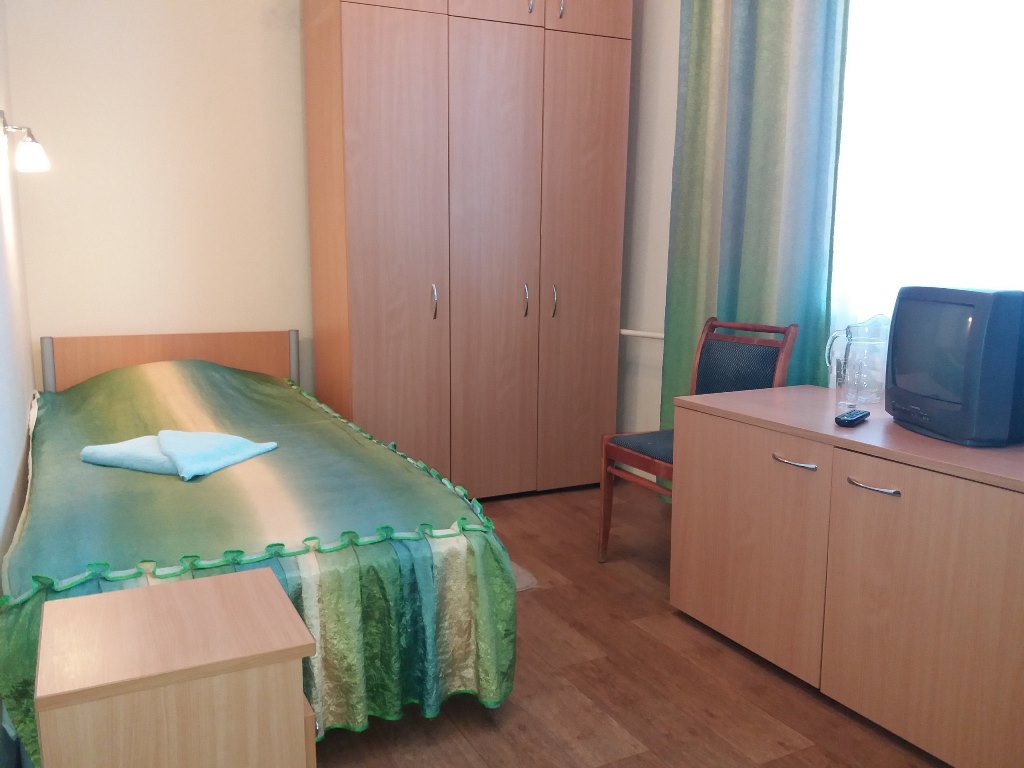 Однокомнатный номер площадью 12,6 м2 . В номере имеются односпальная кровать, ТВ, холодильник, шкаф для одежды, тумба, санузел (душ, унитаз, раковина)