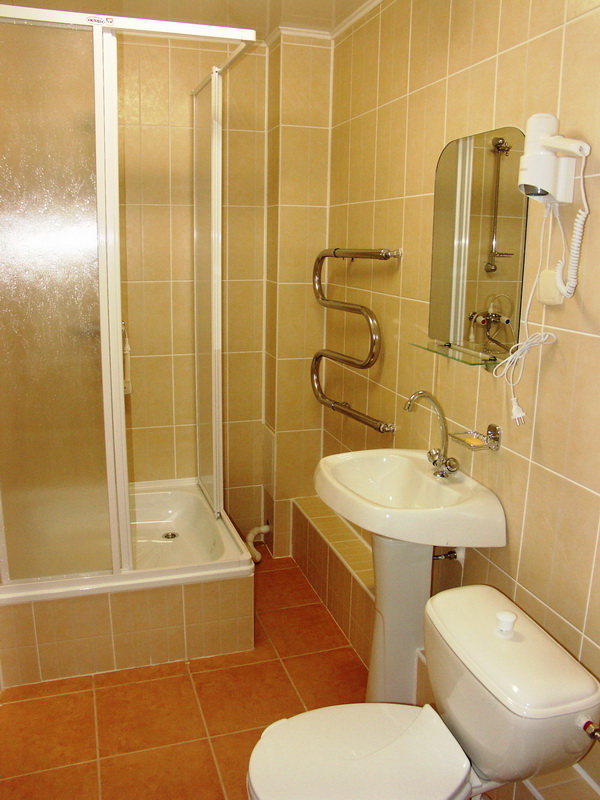 Односпальная кровать, ТВ, холодильник, кресло, журнальный стол, телефон, сейф, шкаф, совмещенные душ и санузел. Площадь номера 9,5кв.м.