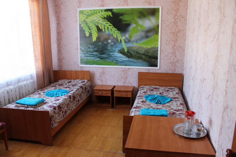 Площадь номеров 10кв.м.: в номере две или три односпальные кровати, тумбы, шкаф для белья, душ и санузел совмещен (общий на блок).