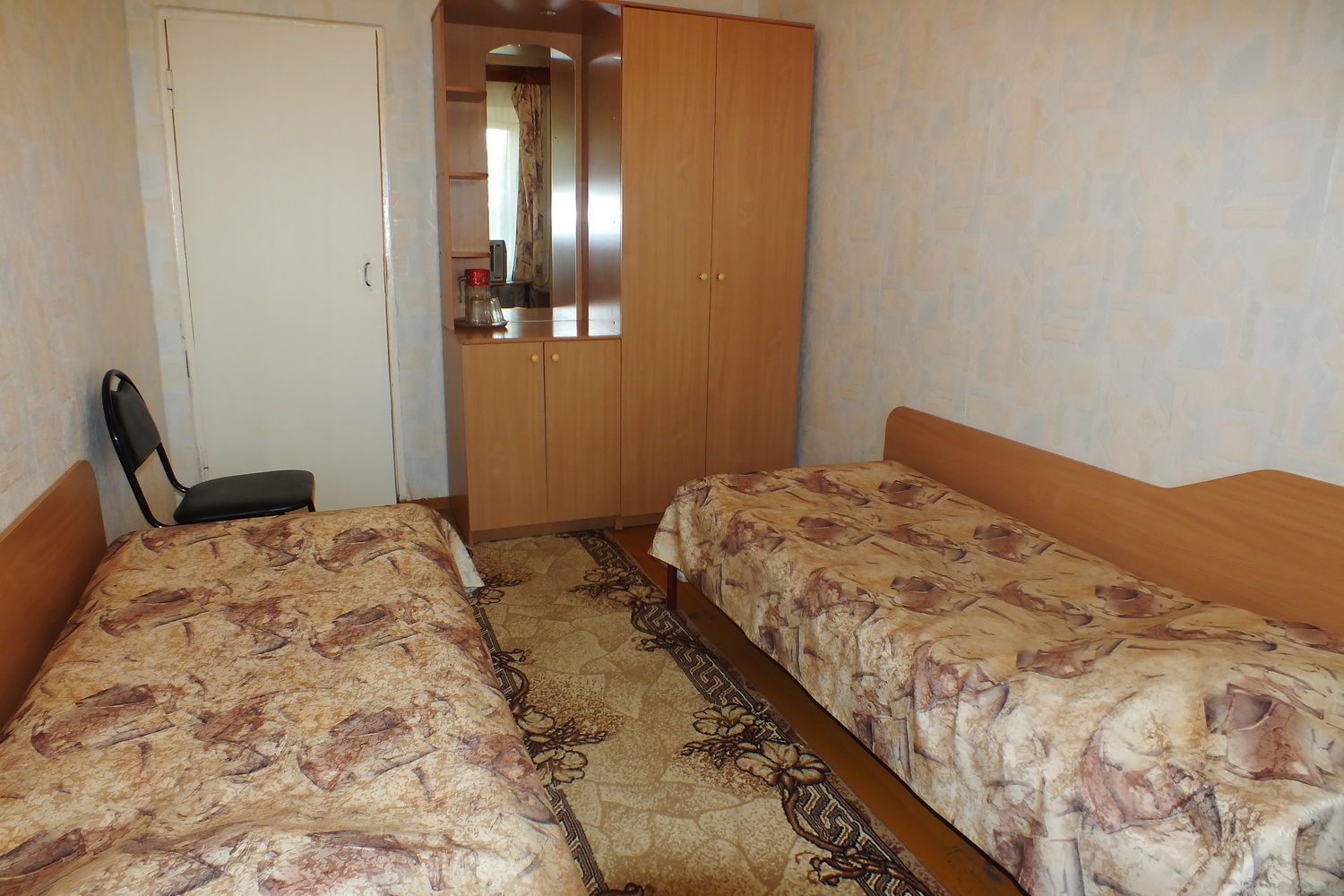 Две 1-спальные кровати, тумбы, ТВ, посуда, шкаф для белья. Душ с поддоном и санузел совмещен, балкон (в номерах с видом на озеро).