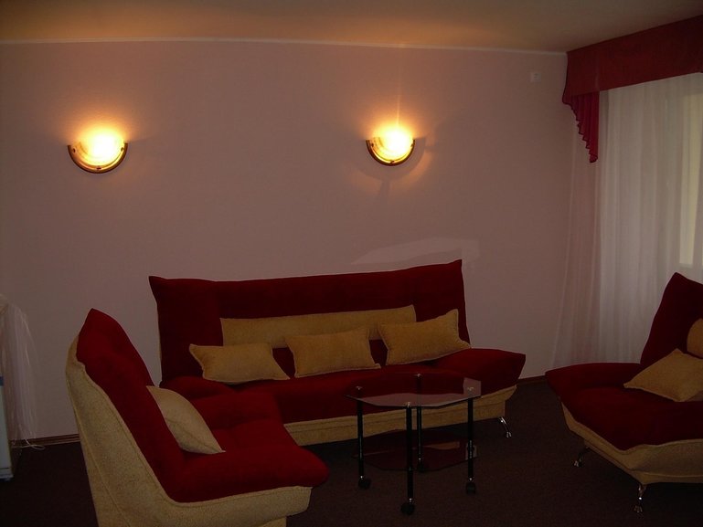 Двуспальная кровать, комплект мягкой мебели, журнальный столик, ТВ, холодильник, кондиционер, набор посуды, эл.чайник, фен, джакузи или минисауна, душевая кабинка, санузел, балкон, прихожая со шкафом.