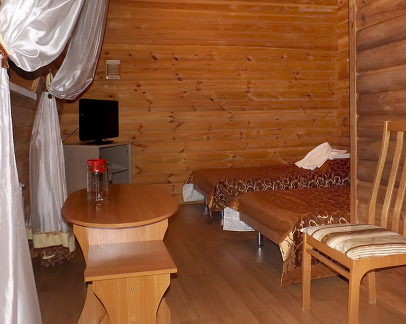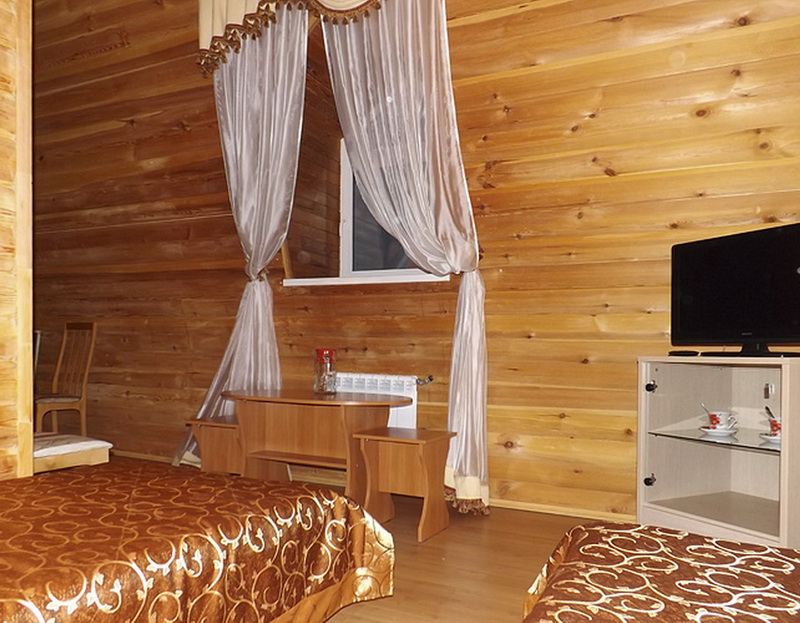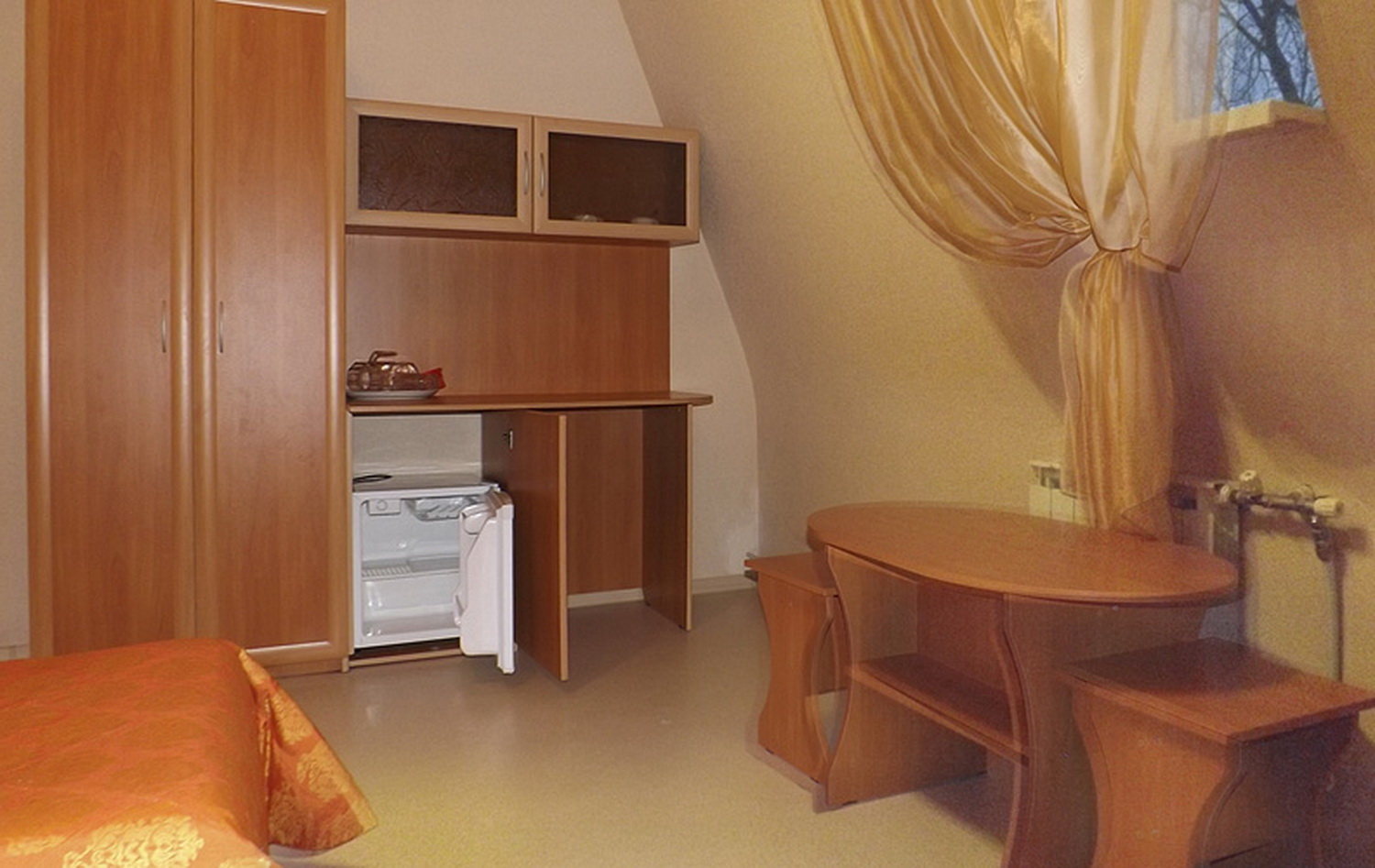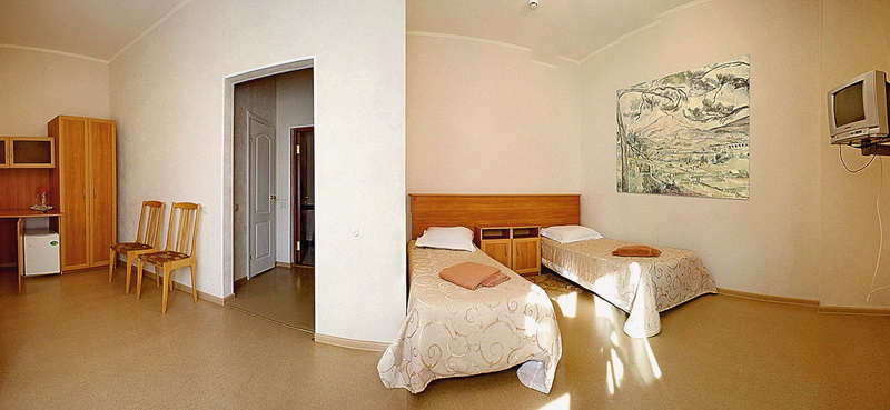 В номере: две односпальные кровати, тумбы, стенка-горка с посудой, телевизор, холодильник, душ.кабина (ванна), чайник, посуда, балкон.