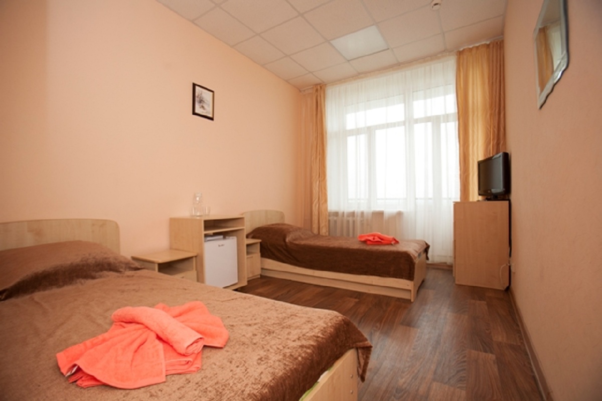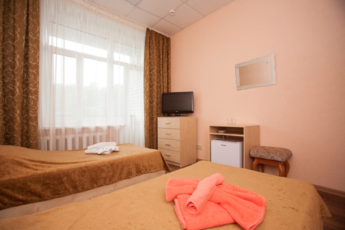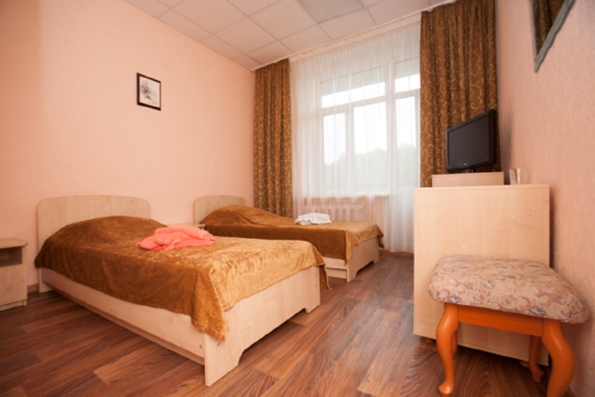 Площадь номера 16кв.м.: в номере две полутороспальные кровати, две прикроватные тумбы, шкаф для одежды, телевизор, холодильник, балкон, санузел, душ.