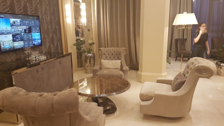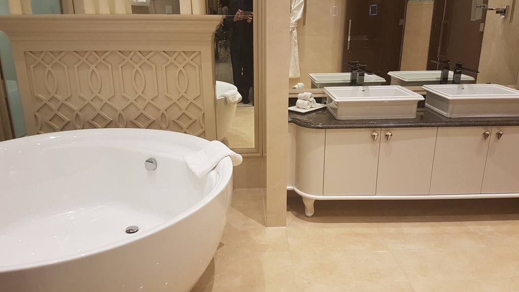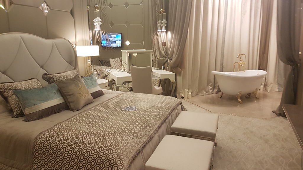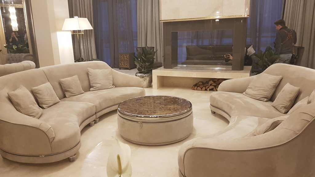 Гостиная с мягкой зоной, две спальни с кроватями (200x220см.), кухня, гардеробная комната, две ванных комнаты; кофейный столик, стол с письменными принадлежностями в каждой комнате; кабельное ТВ, центральная система кондиционирования, телефон, wi-fi, оборудование для видеоконференций; обеденная группа, минибар, камин, сейф; банные принадлежности и аксессуары; сервис в номерах 24/7. Общая площадь номера: 280 м2.
