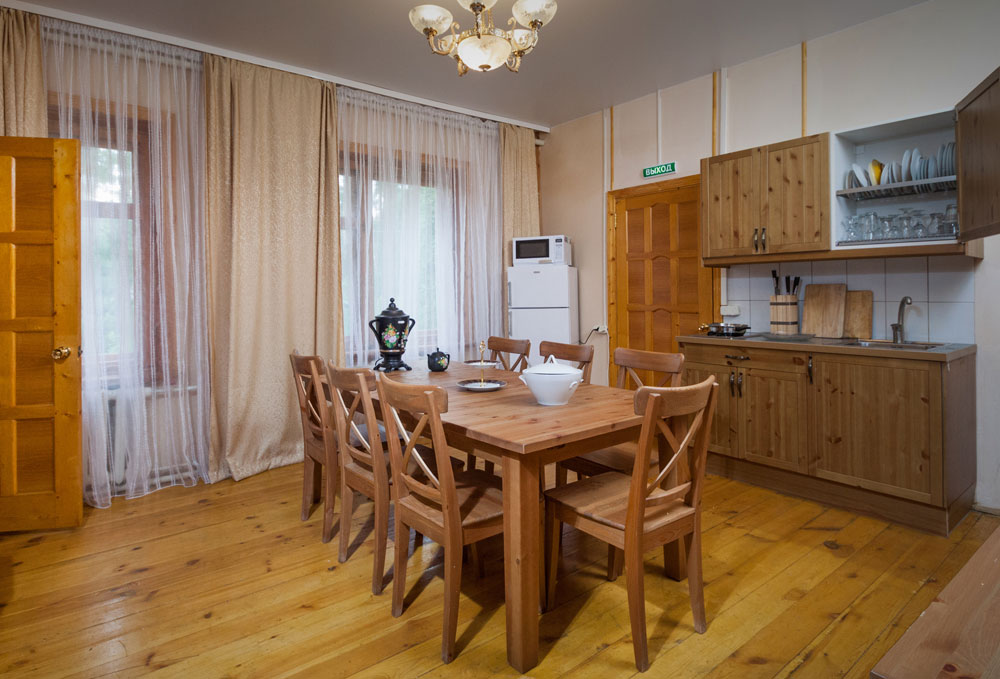 Отдельно стоящий двух этажный дом состоящий из пяти однокомнатных, двухместных номеров. В каждой спальне двуспальная кровать, раскладной диван или кресло, телевизор, холодильник, прикроватные тумбочки, шкаф для одежды. Есть оборудованная кухня (эл. плитка, холодильник, свч печь, эл. чайник, большой обеденный стол, полный набор посуды, телевизор) Из удобств - три туалета и два душа. Рекомендуемое размещение 11 человек.