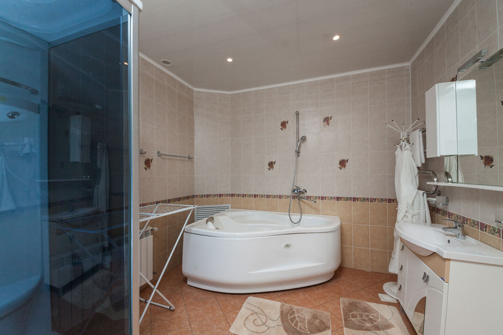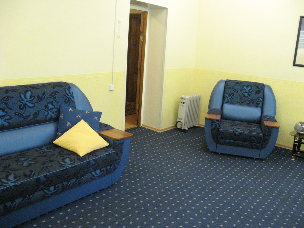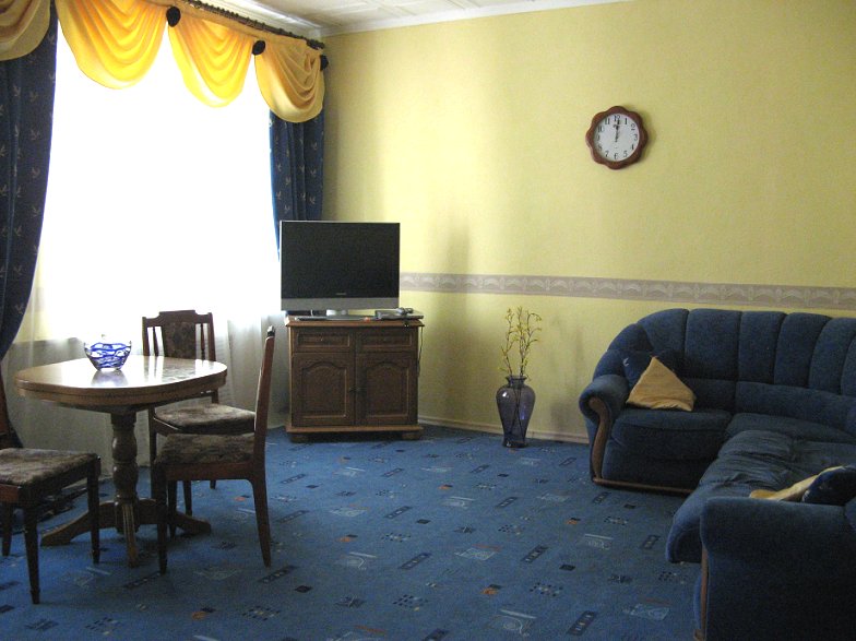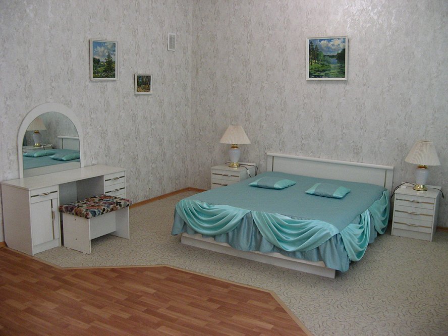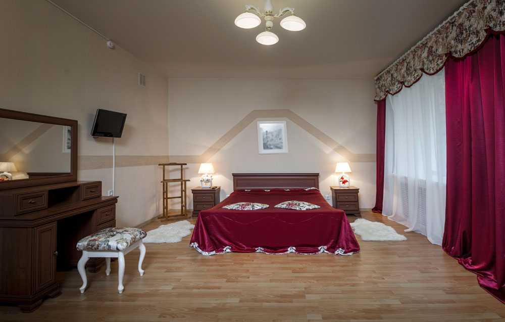 Площадь номера 93кв.м. В номере просторная гостинная с мягкой мебелью, телевизор, холодильник, посуда, в спальне-двуспальная кровать, шкаф для одежды и телевизор. В ванной комнате угловая ванная, биде, душевая кабина и сауна.