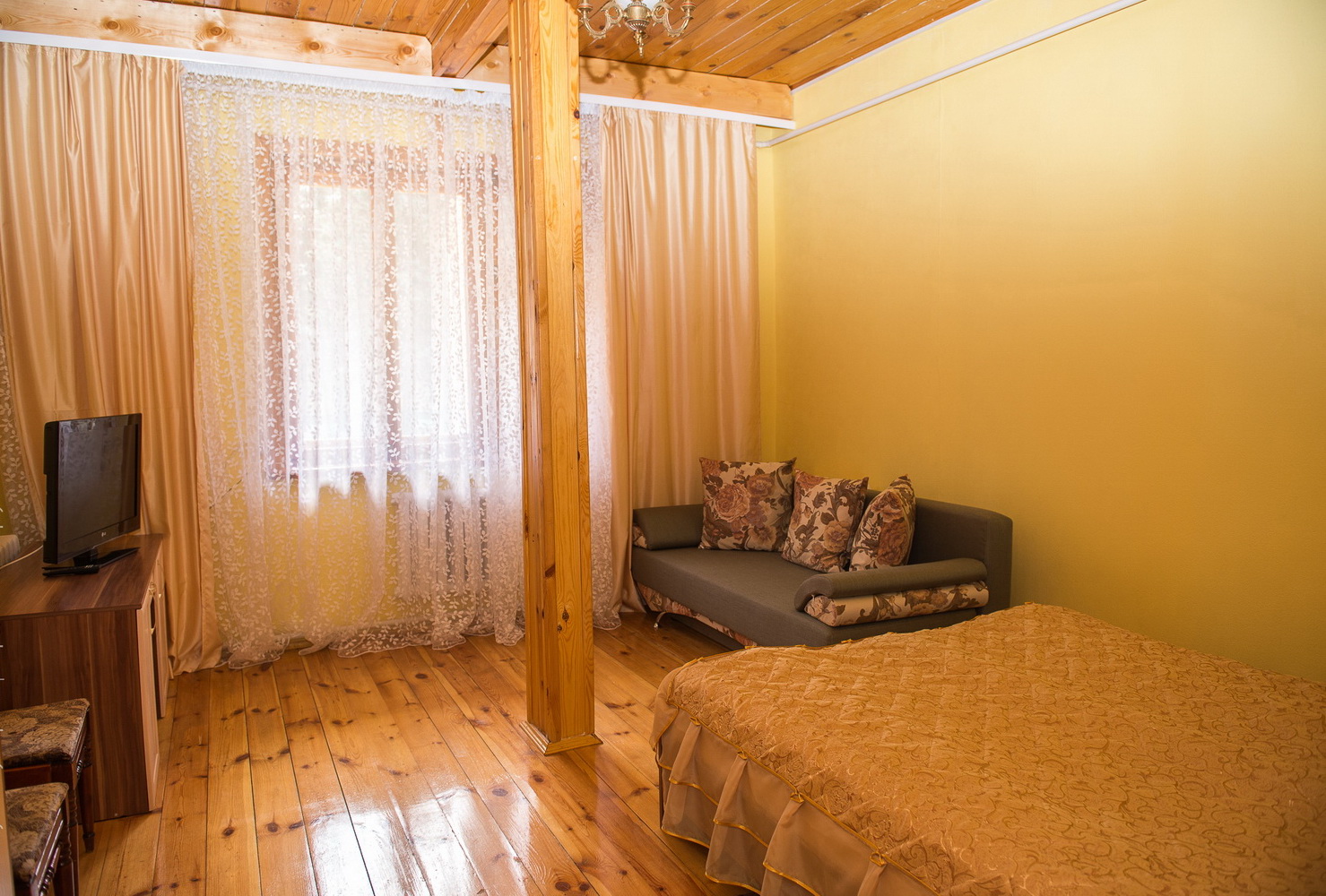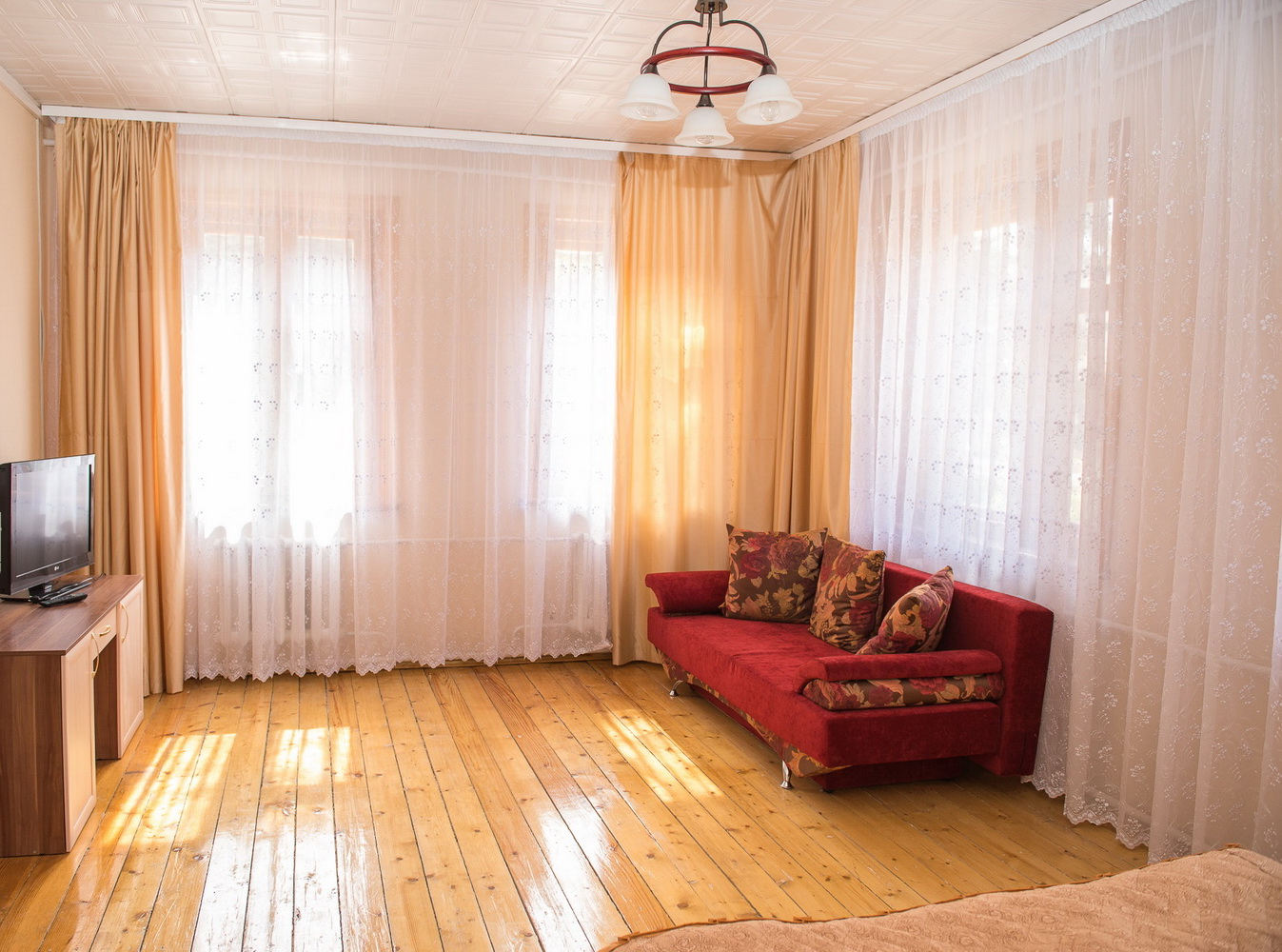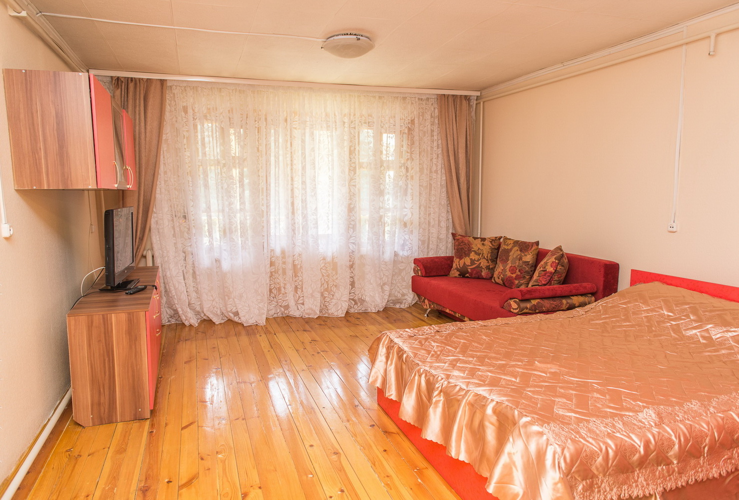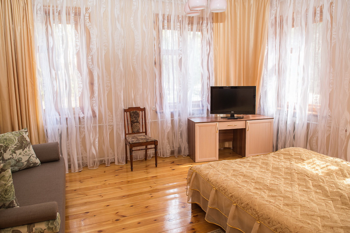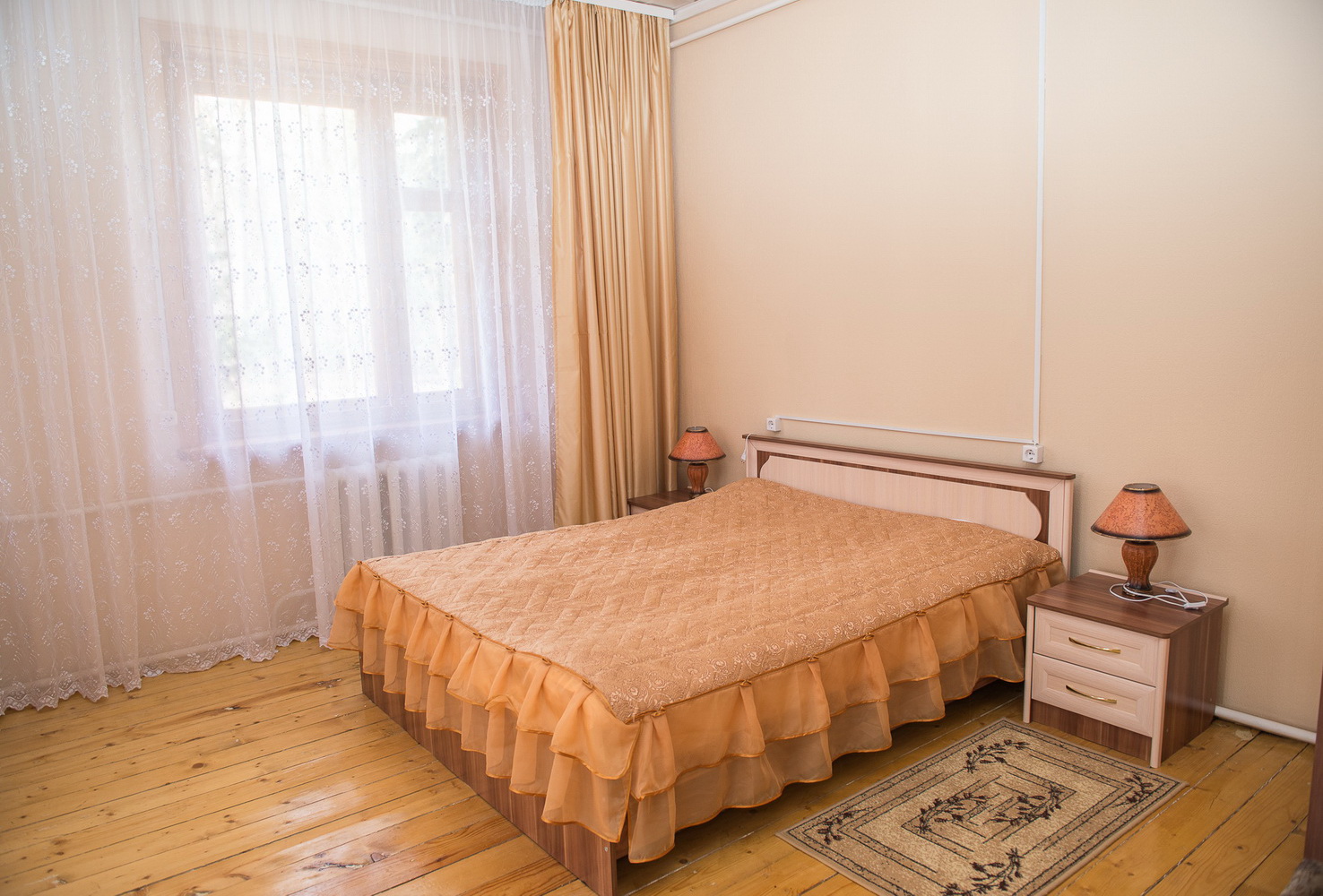 2-этажный дом расположен на территории санатория "Васильевский". На первом этаже 4 спальни, 3 туалета и 2 душа, кухня. В холе на 1м этаже есть музыкальный центр и диван. На 2-м этаже – 1 спальная комната. В каждой спальне имеется 2-х спальная кровать, раскладывающийся диван или кресло, телевизор, холодильник, прикроватные тумбочки, шкаф для одежды. Кухня полностью оборудована: электрическая плитка, холодильник, СВЧ-печь, электрочайник, большой обеденный стол, полный набор посуды, телевизор.